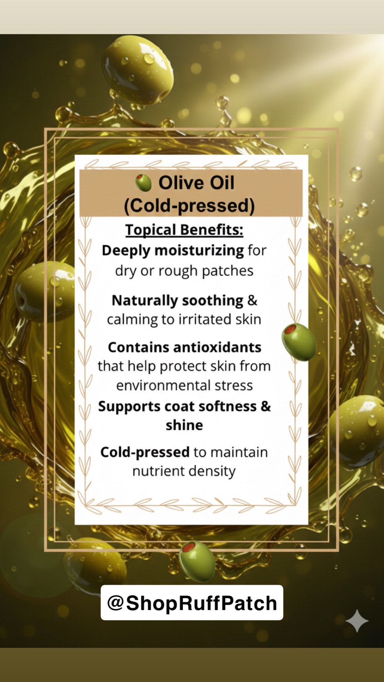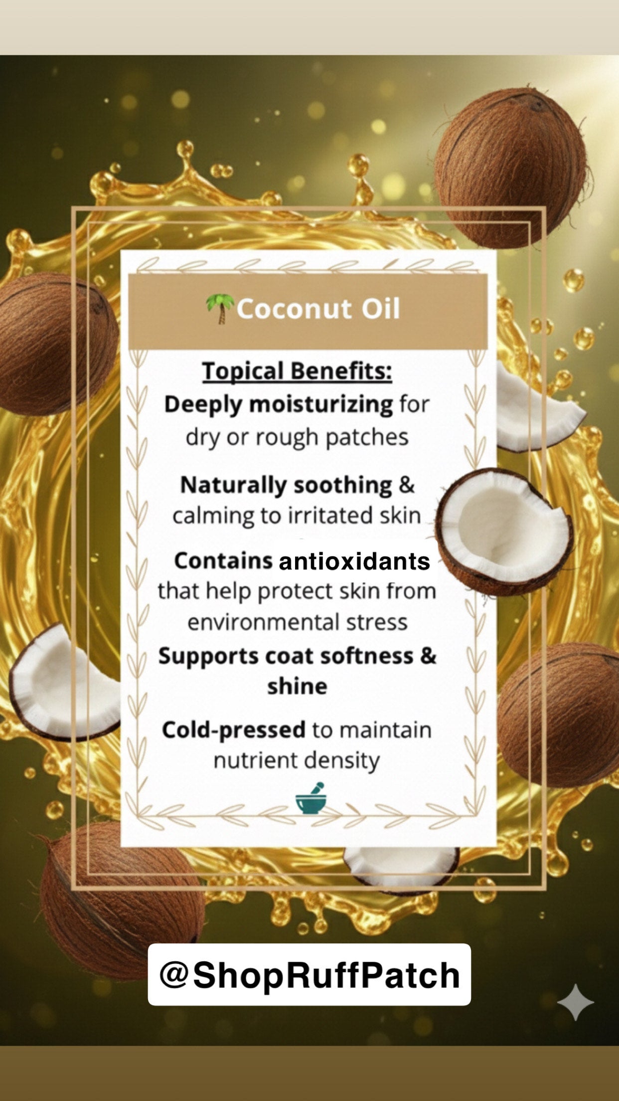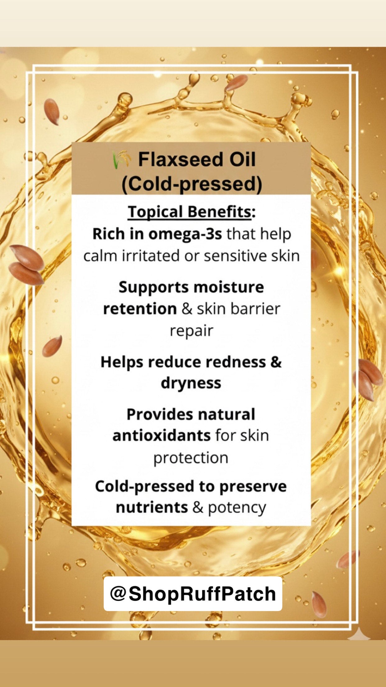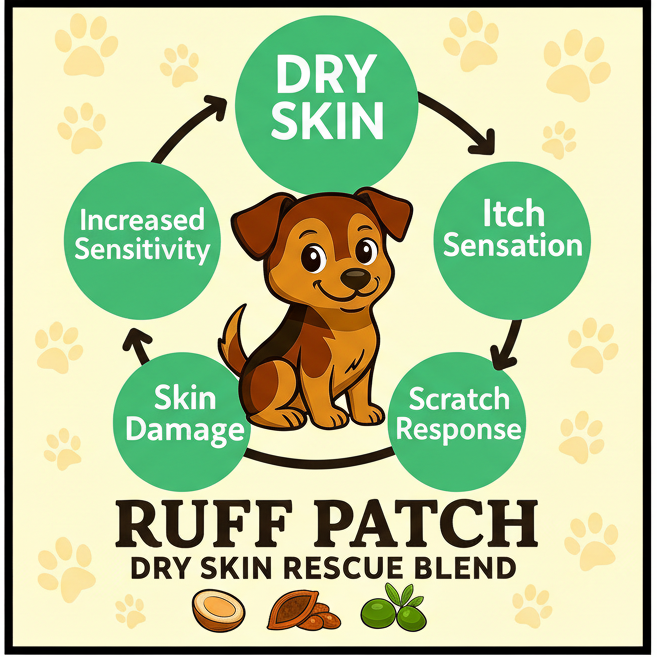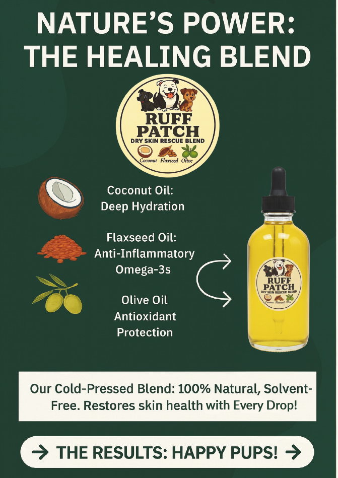 RUFF PATCH Dry Skin Rescue Blend works so effectively because it combines three powerhouse natural oils — Coconut Oil, Flaxseed Oil, and Olive Oil — in a cold-pressed, 100% natural, solvent-free formula. This ideal trio delivers deep nourishment, targets inflammation, and provides protective antioxidants, creating a synergistic effect that's perfect for dogs suffering from dry, flaky, itchy skin.